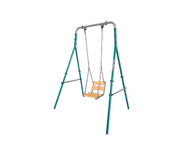 Широкое деревянное сидение качелей сможет уместить как ребенка, так и взрослого, имеет под собой прочный металлического каркас и для подвеса снабжена металлической цепью, благодаря чему качели обладают повышенной износостойкостью.